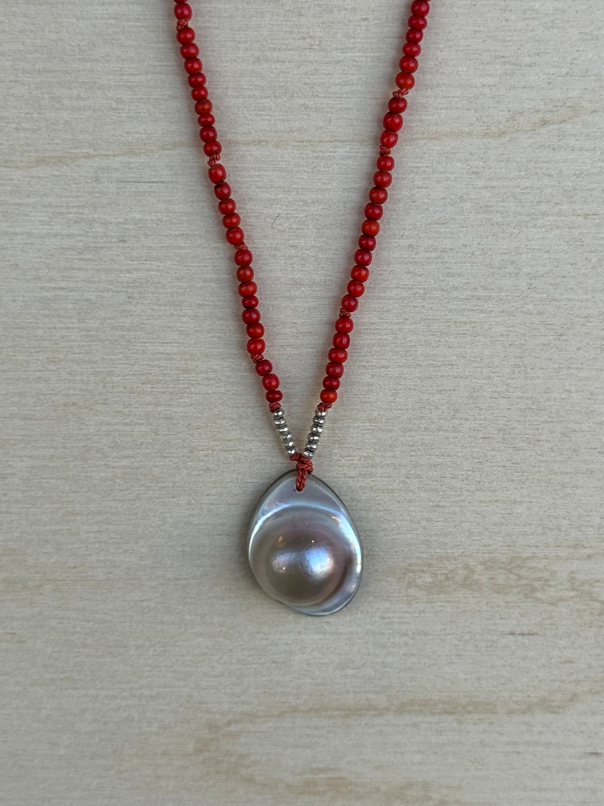 Hand knotted on orange silk cord.