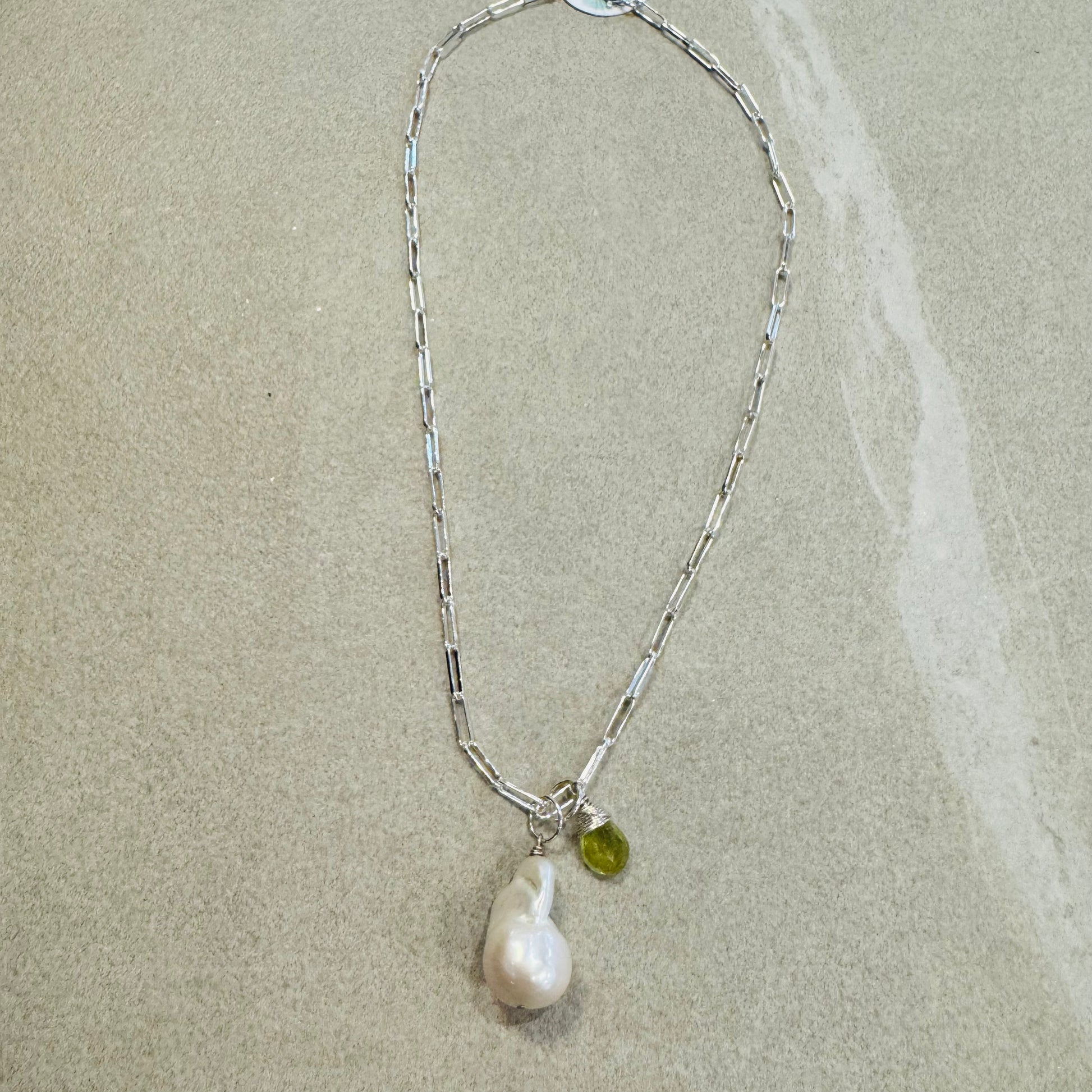 18" Sterling silver, yellow tourmaline, fresh water pearl