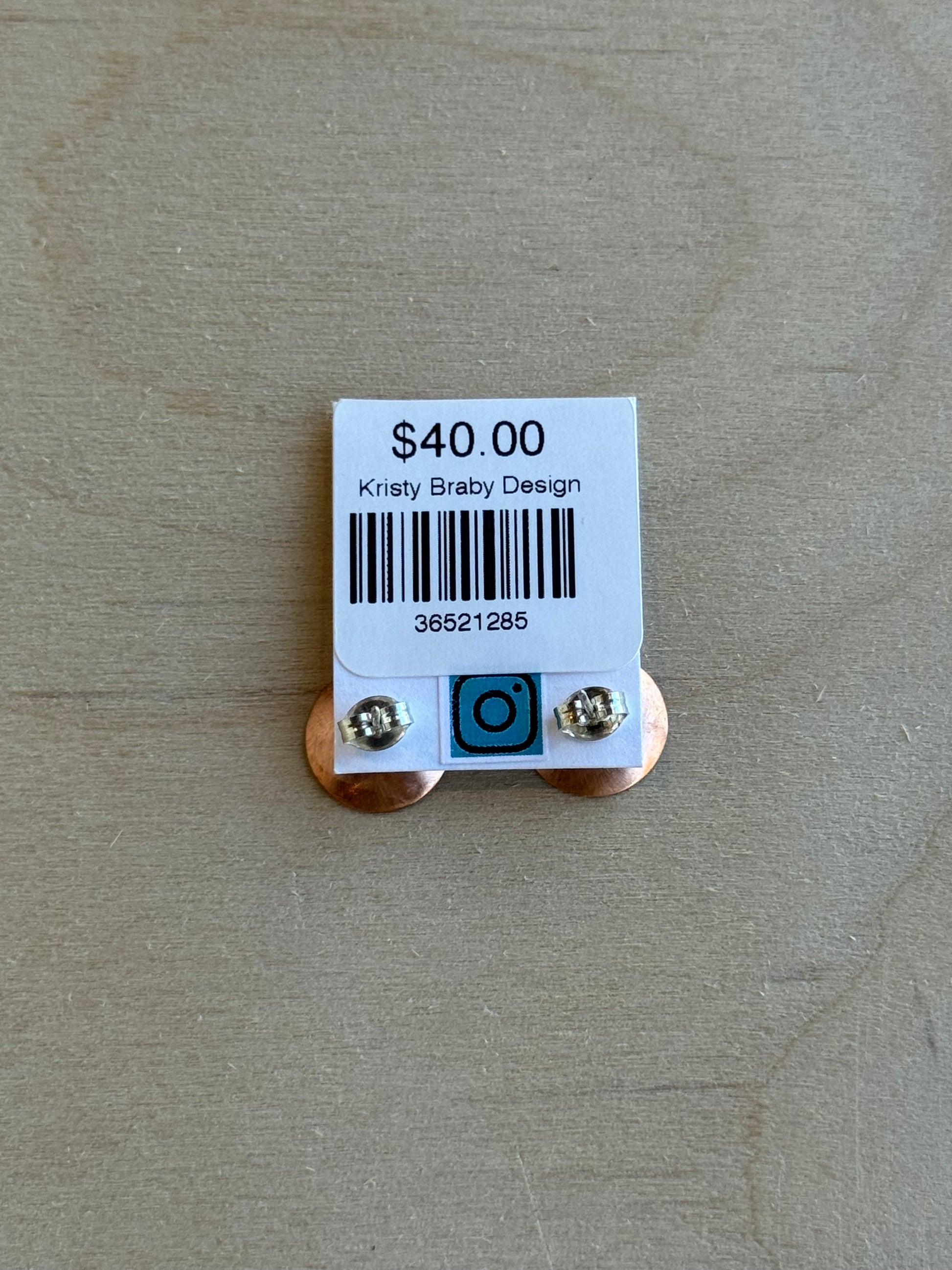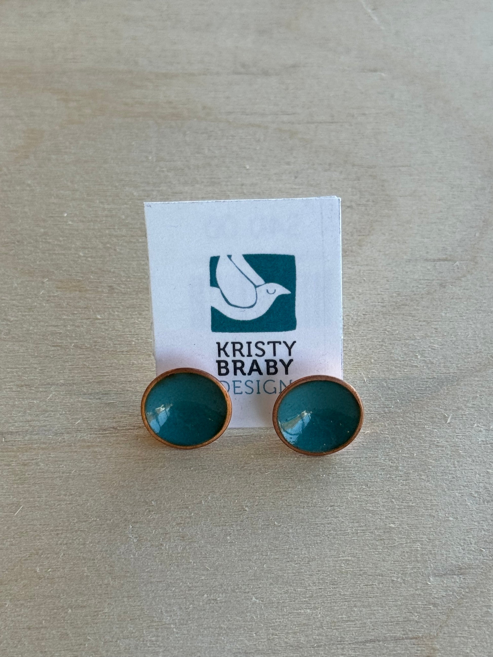Hand-cut, kiln fired enameled copper disc with sterling silver post.
